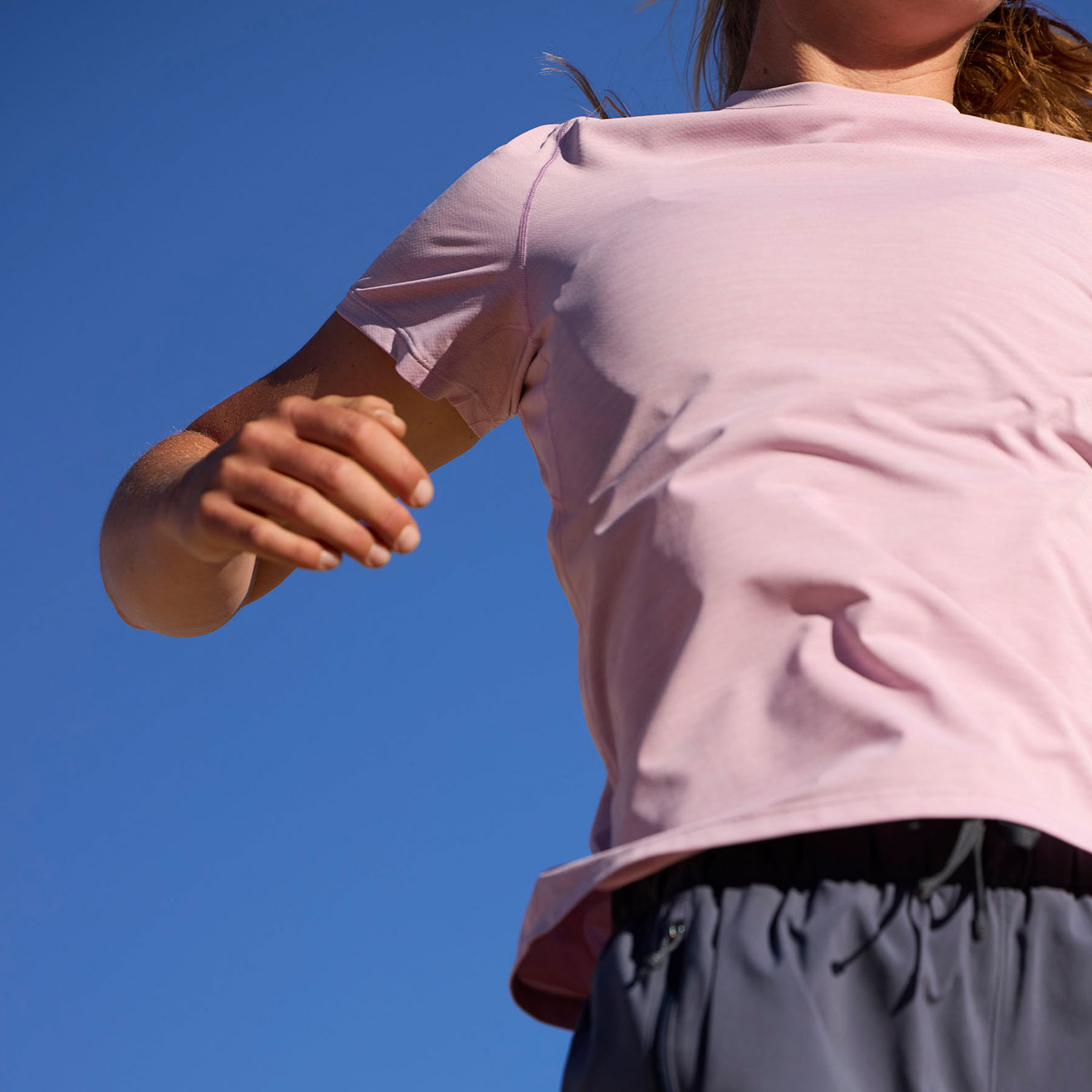 Ultralightweight, 100% recycled textured-knit fabric dries in a flash so you stay comfortable during high-exertion moments
