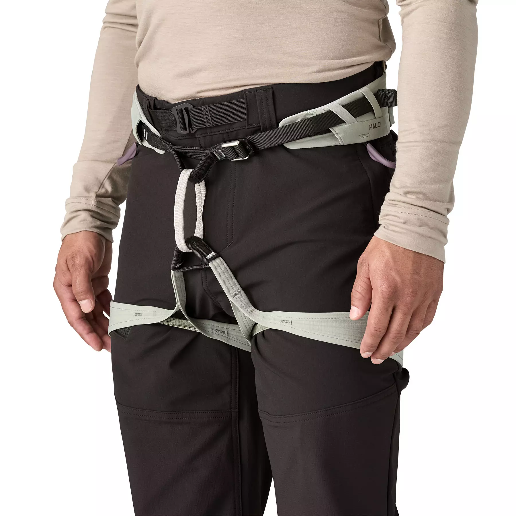 Gusseted crotch and prominent knee articulation for freedom of movement; designed for a sleek fit under a backpack waistbelt or a harness