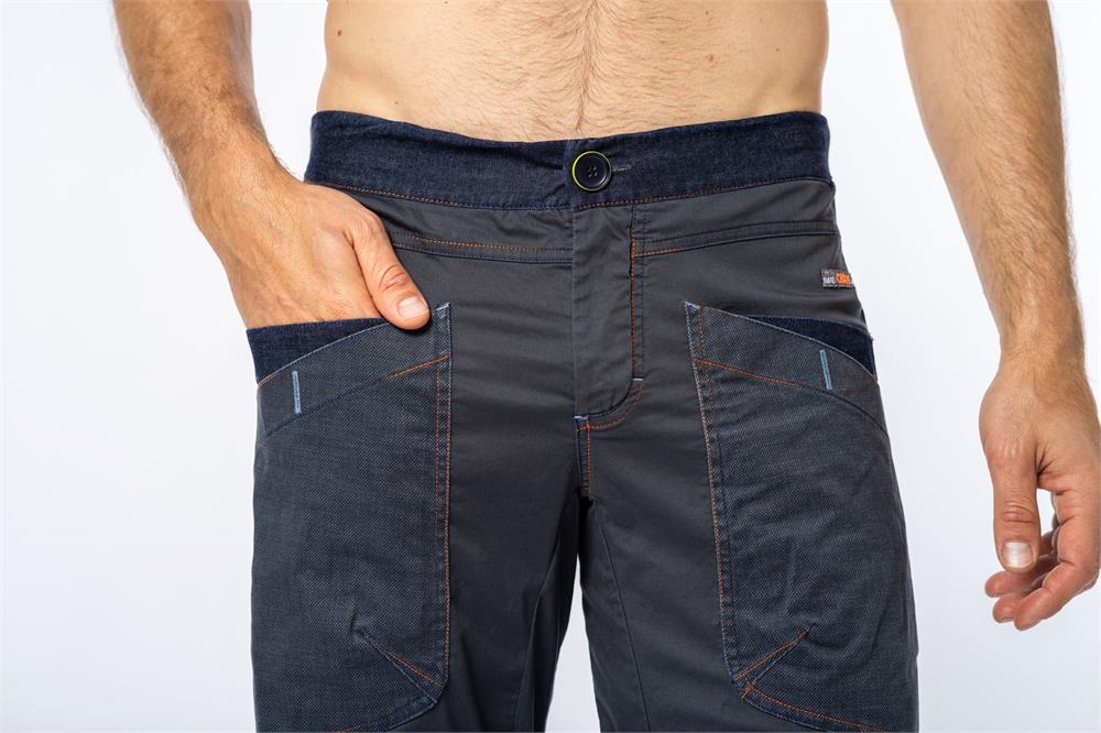 Made from Performance cotton or INDIGO JEANS, with a comfortable open waistband with an adjustable drawstring and a button closure.