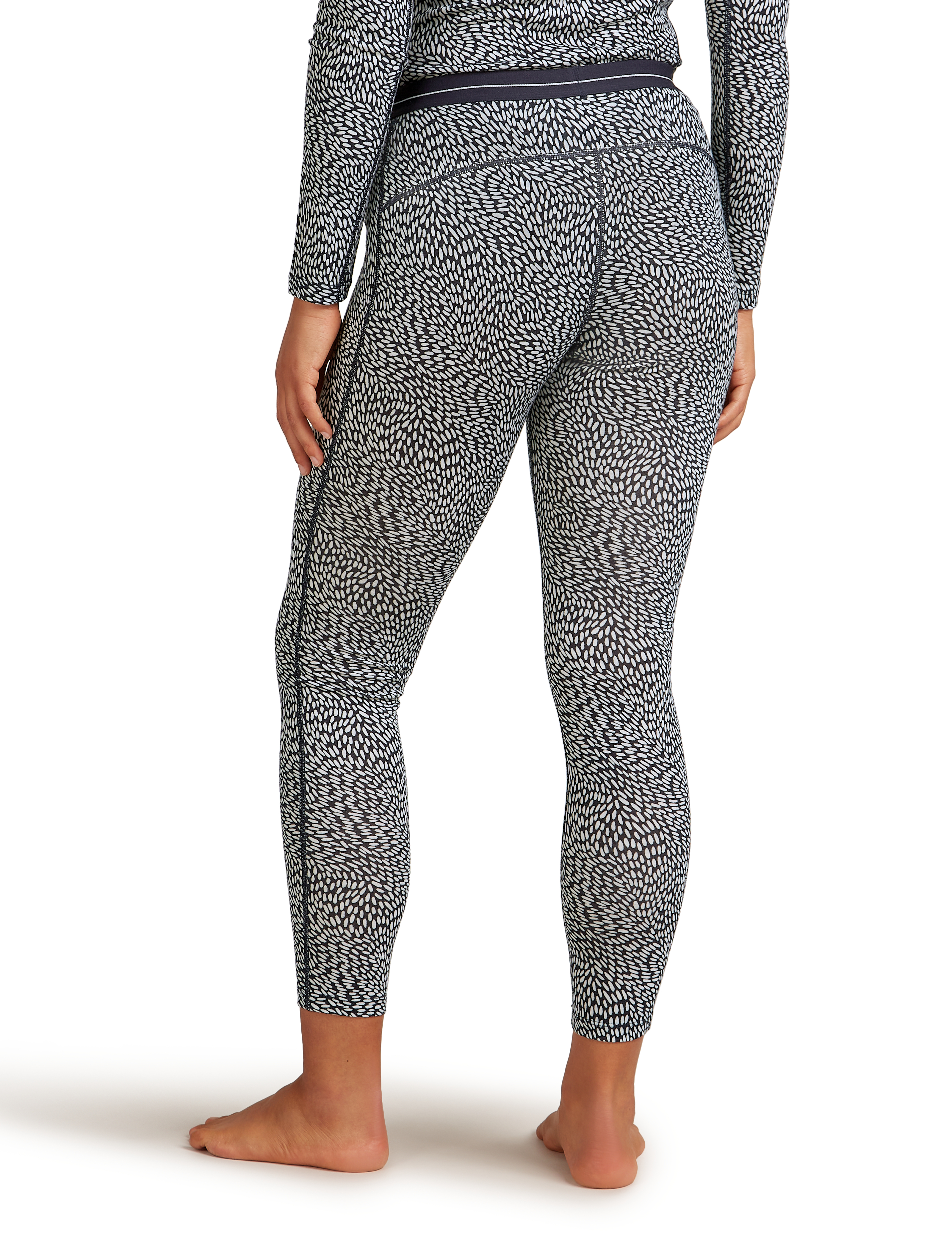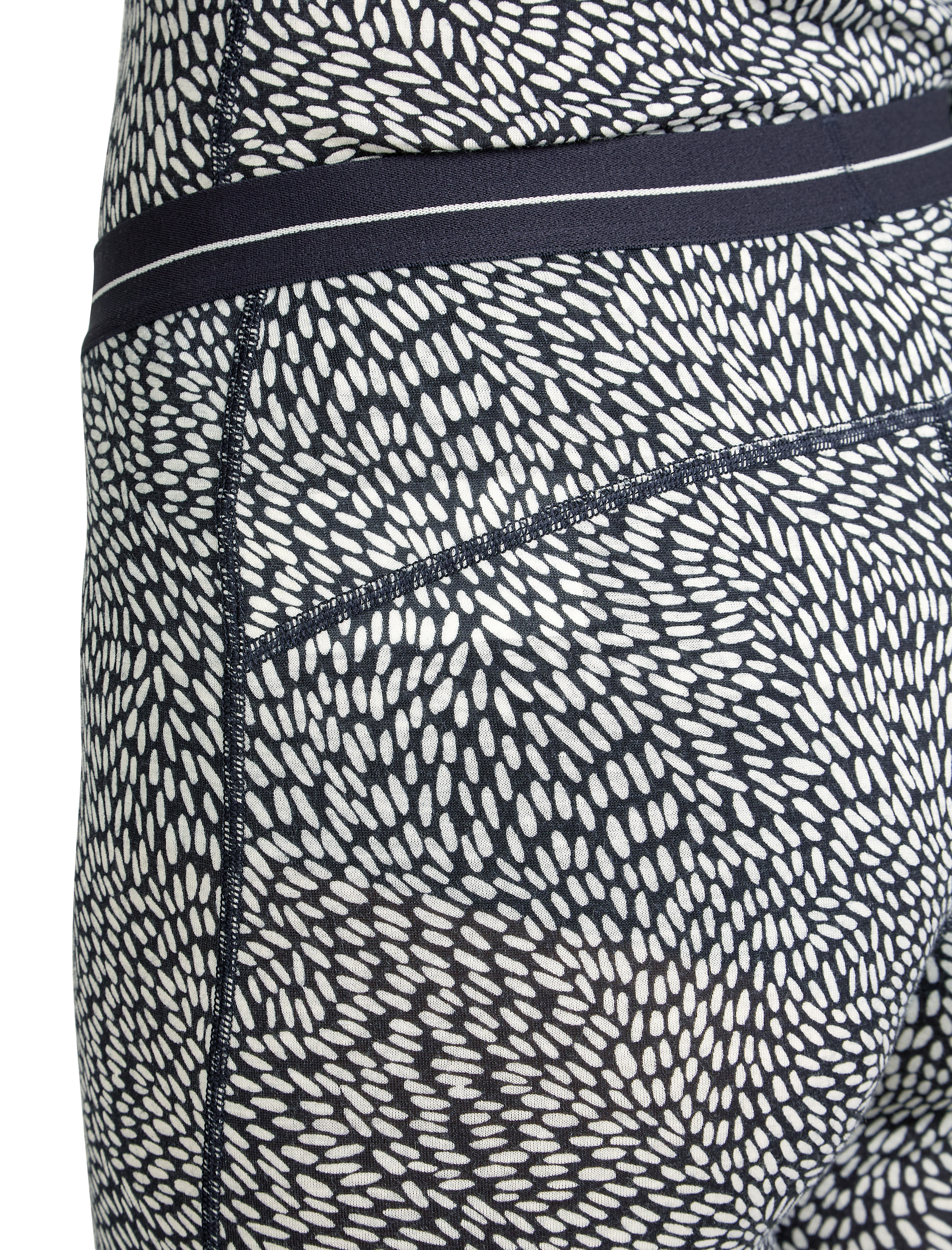 The fabric’s stretch allows unrestricted movement, while flatlock seams eliminate chafing. The wide elastic waistband provides a secure yet comfortable fit. The unique Flock Forms print adds a stylish touch to their technical performance.