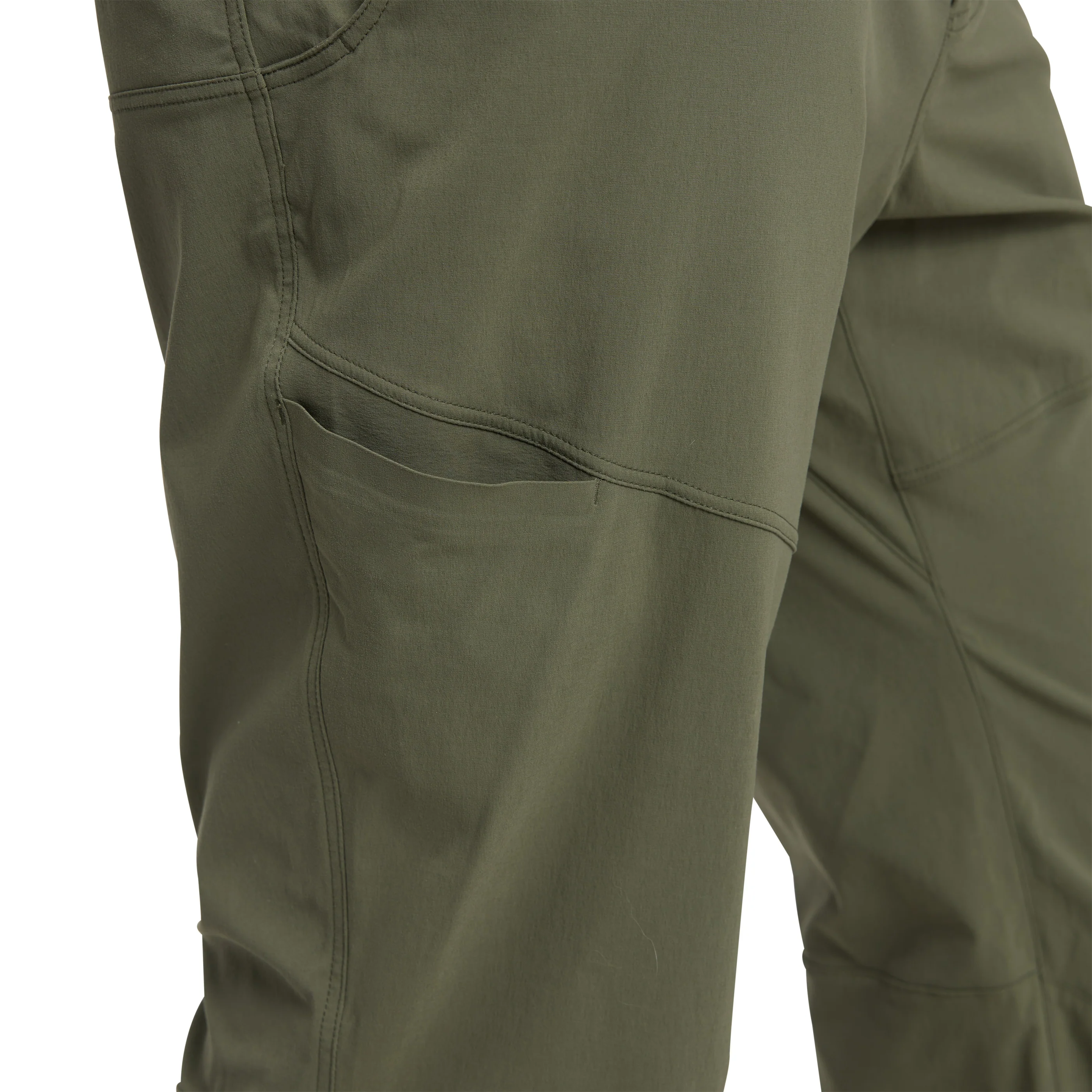 Функционалните детайли включват клиновиден шев отвътре за удобство при по‑високи крачки и артикулирани колене за лесно катерене по камъни, както и регулируема долна част на крачола, подходяща за колоездене или катерене. Правият силует е комбиниран с практични джобове — два предни джоба, два задни и един скрит джоб с цип на бедрото за закуска или телефон.